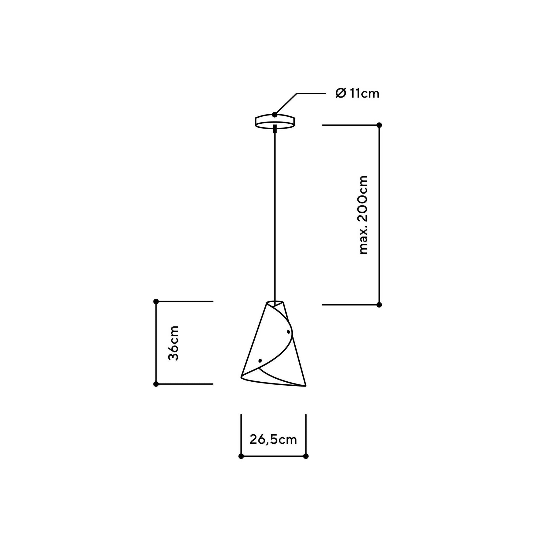 | Maße | Lampenschirm: Ø unten 26,5 cm | Ø oben 7 cm | Höhe 36 cm Baldachin: Ø 12 cm | Höhe 2,5 cm Kabel: Länge 200 cm |