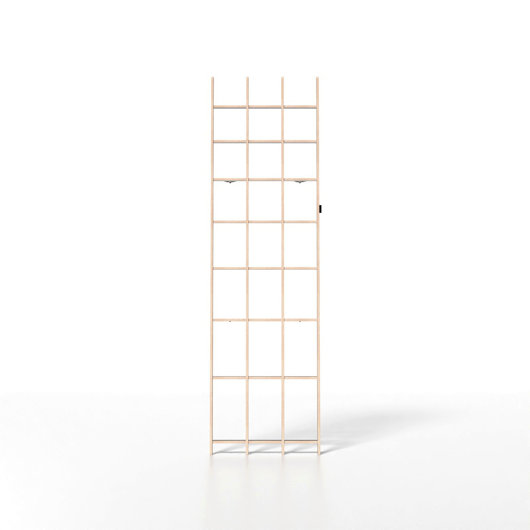 Das Regal trägt Bücher bis zu einem Format von 24 × 32 cm und bleibt dabei extrem schlank mit nur 17 cm Tiefe. Dank der cleveren Konstruktion wird die gesamte Last über den Boden abgeleitet – die Wandmontage dient nur der Kippsicherung. Der Wandabstand von 5–12 cm sorgt für eine schwebende, skulpturale Wirkung.