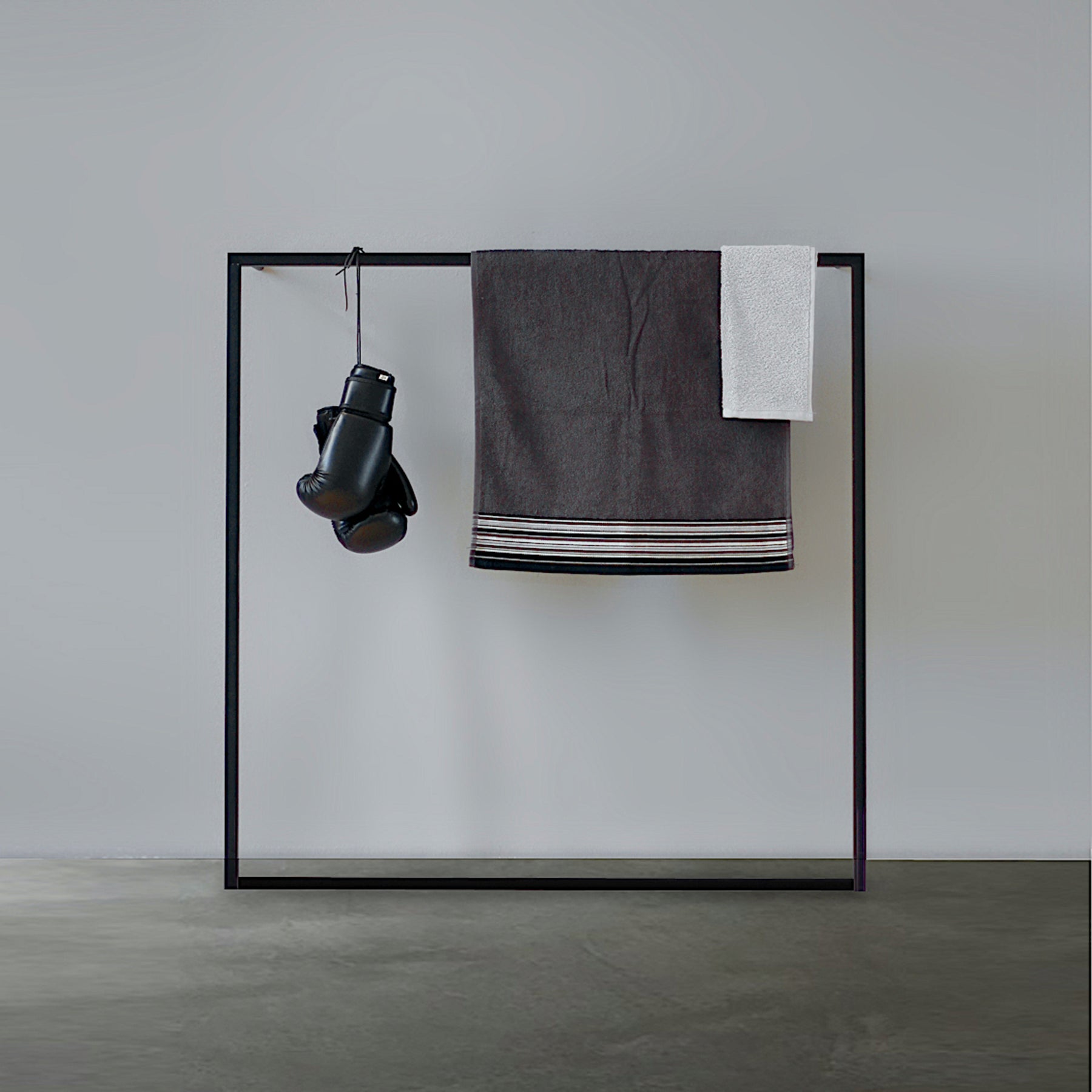 Die schlanke Rahmenkonstruktion aus pulverbeschichtetem Metall steht stabil und setzt zugleich ein grafisches Zeichen im Raum. Der Little Leano wirkt wie ein eleganter Bilderrahmen für Deine Kleidung oder Accessoires – und gewinnt an Stabilität durch seine Nutzung: Je mehr Du aufhängst, desto fester lehnt er sich an Wand und Boden.