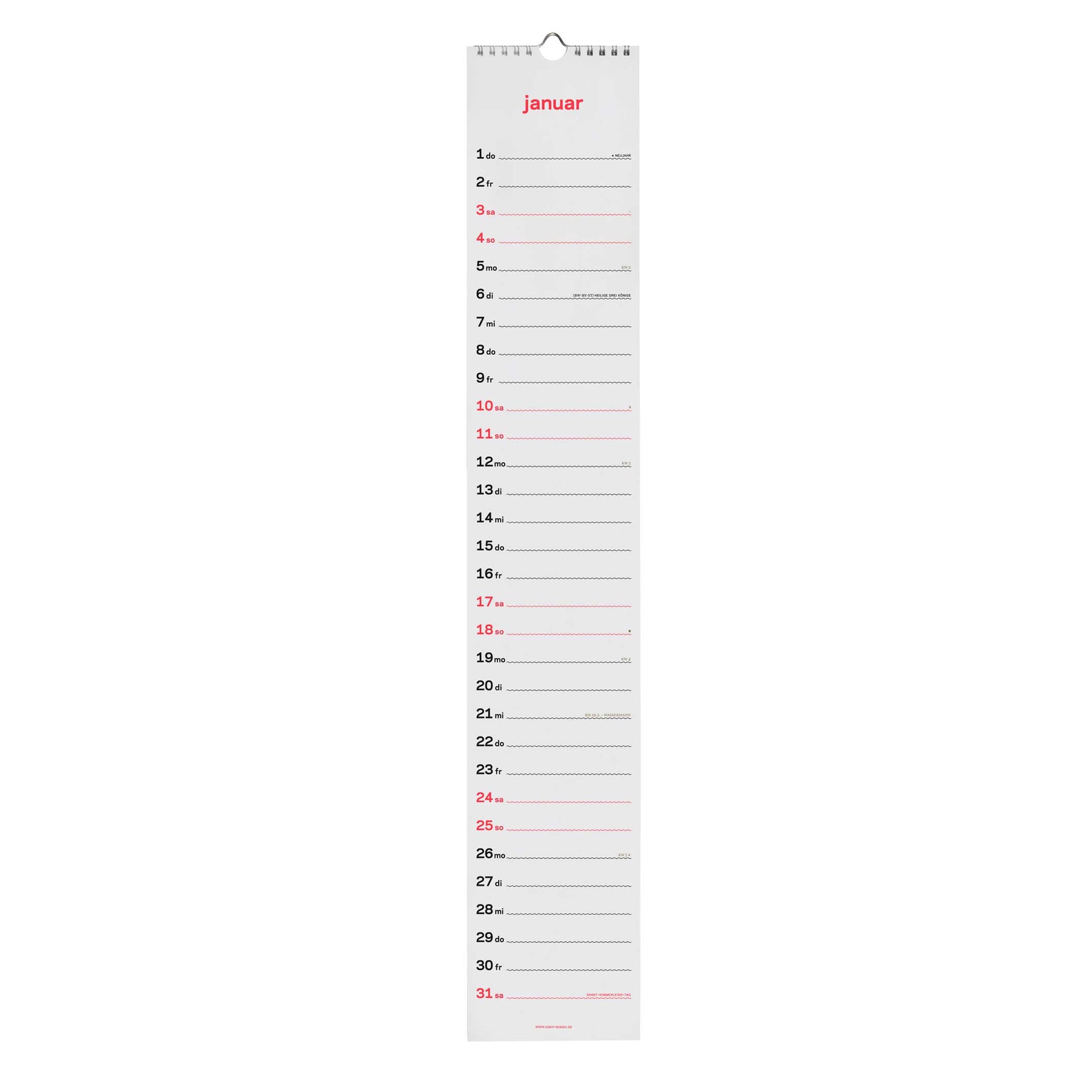 Perfekt neben dem Türrahmen, als Küchenkalender, und überall wo es auf wenig Raum viel Platz für Kalendereinträge geben soll: der rikiki Streifenkalender 2026.