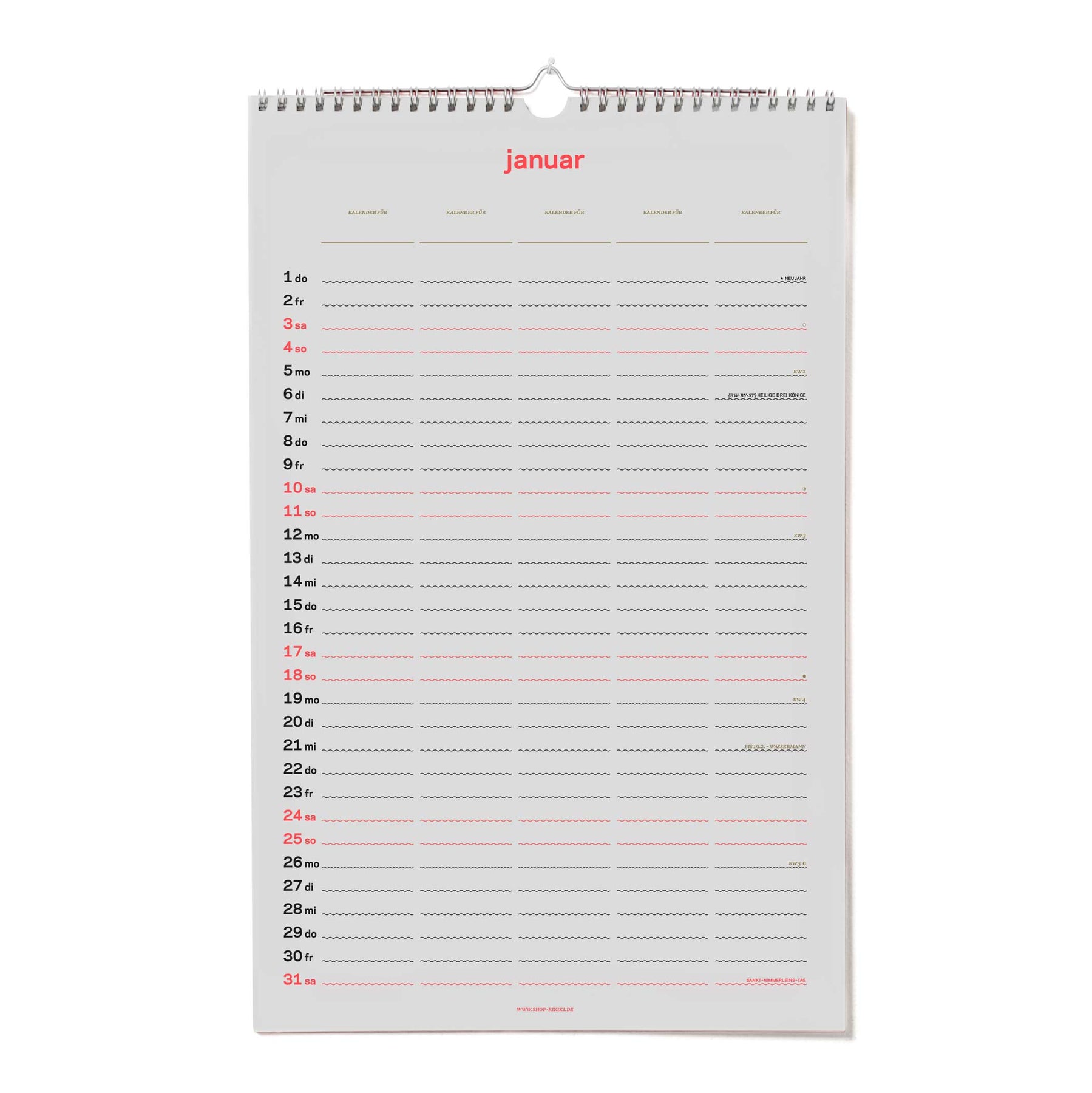 Dies ist rikiki's neuer zweitausend&sechsundzwanzig 12-seitiger Familien-Kalender mit 5 Spalten für Familienmitglieder oder eigenen Kategorien.