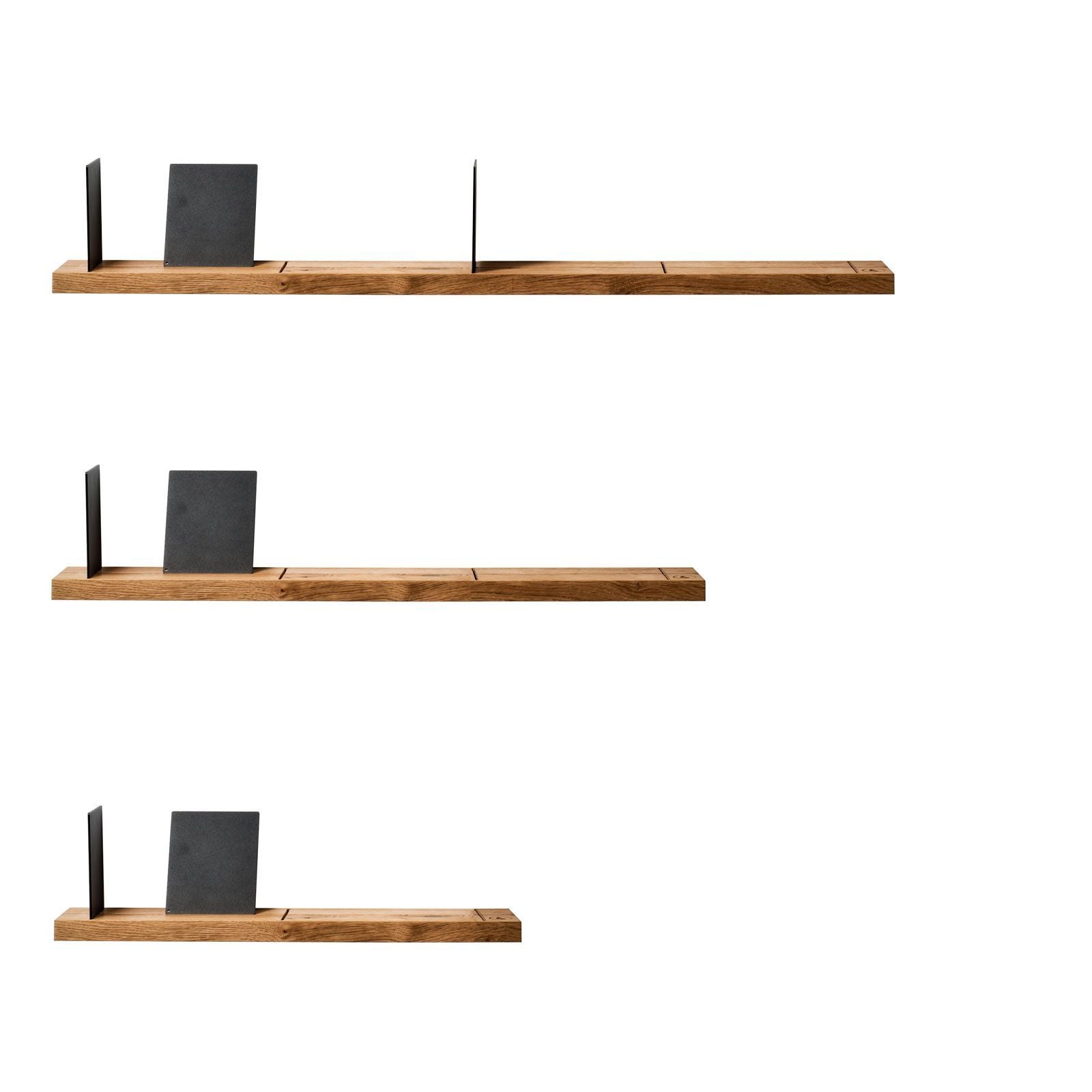 The wall shelf is made of solid oak and has grooves milled into it lengthways and crossways, into which the bookends supplied fit. But pictures, photos and postcards also find their place here without having to be mounted or framed.