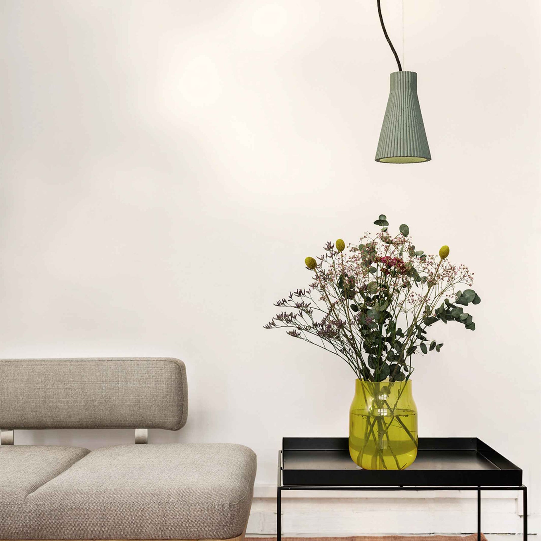 The scope of delivery includes instructions, the handmade concrete lampshade and the socket configuration made from CE-certified components by a certified electrician. This consists of an E14 brass socket with steel cable and strain relief, a textile cable as well as the required fixing material and a metal canopy.