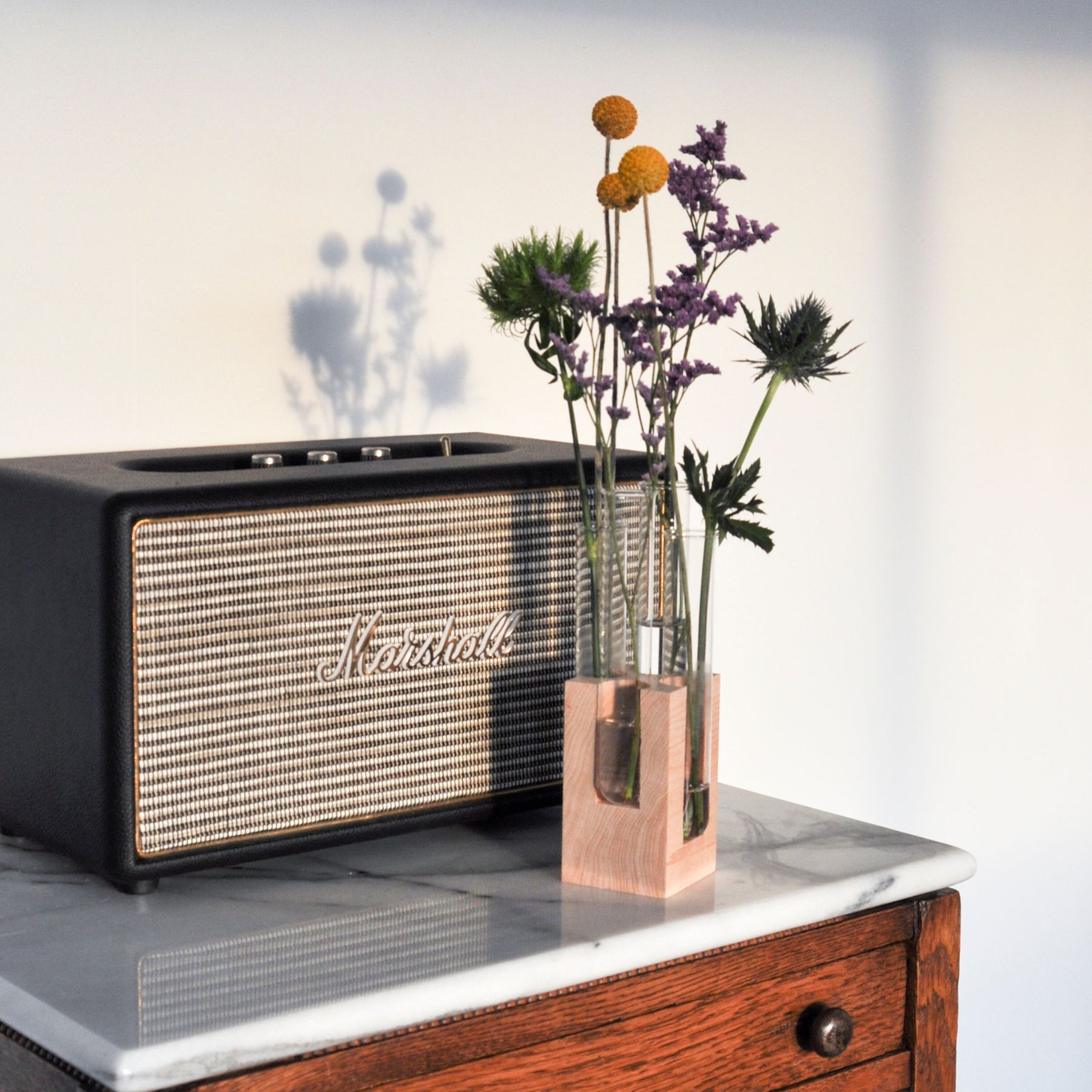 The Block 4 vase from FIGR1 combines minimalist design with natural materials. Whether in light maple or warm mahogany - both versions bring floral accents to the table, windowsill or shelf with their four glass tubes.