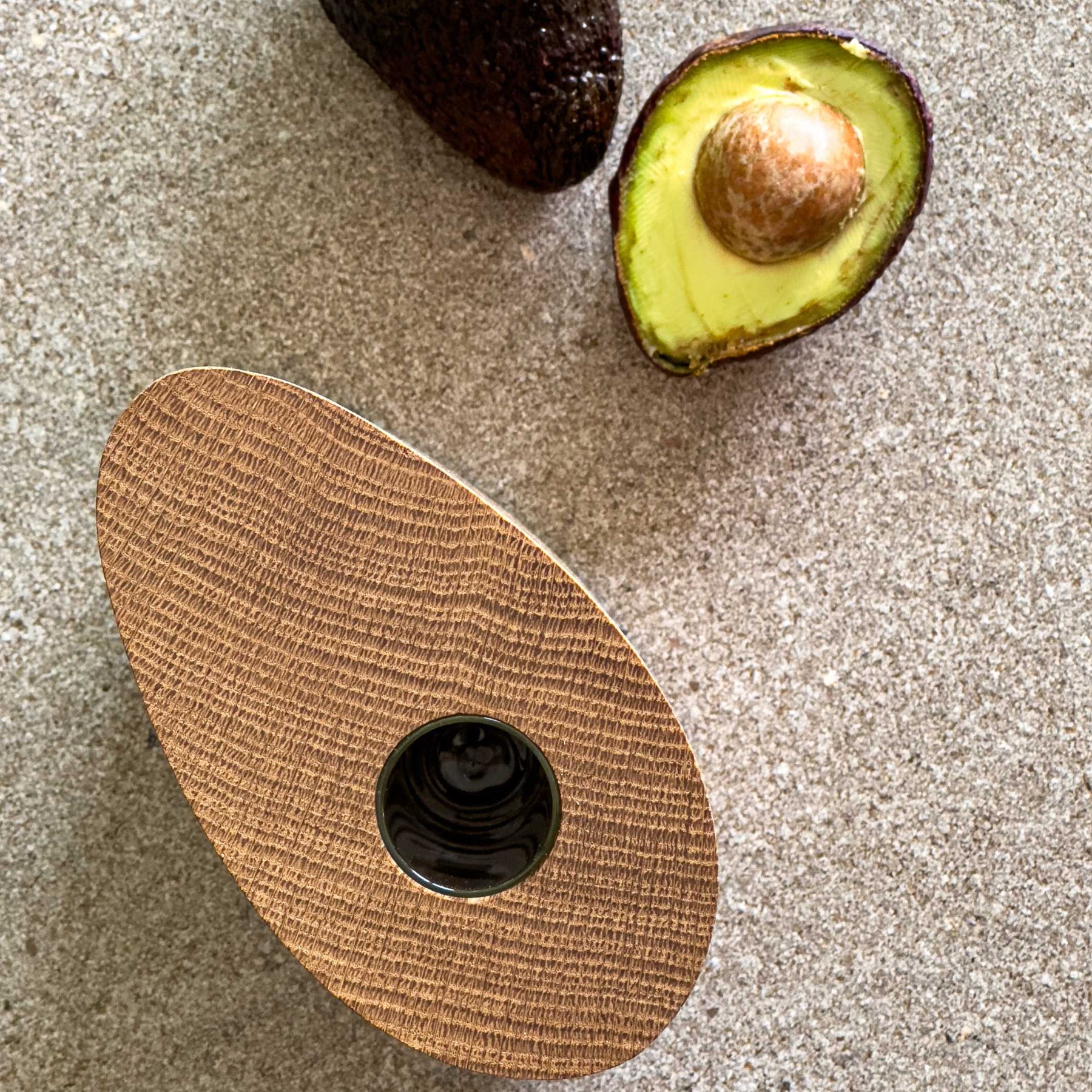 With its organic shape, the wooden vase from the design label finbeaux is reminiscent of an avocado cut in half.