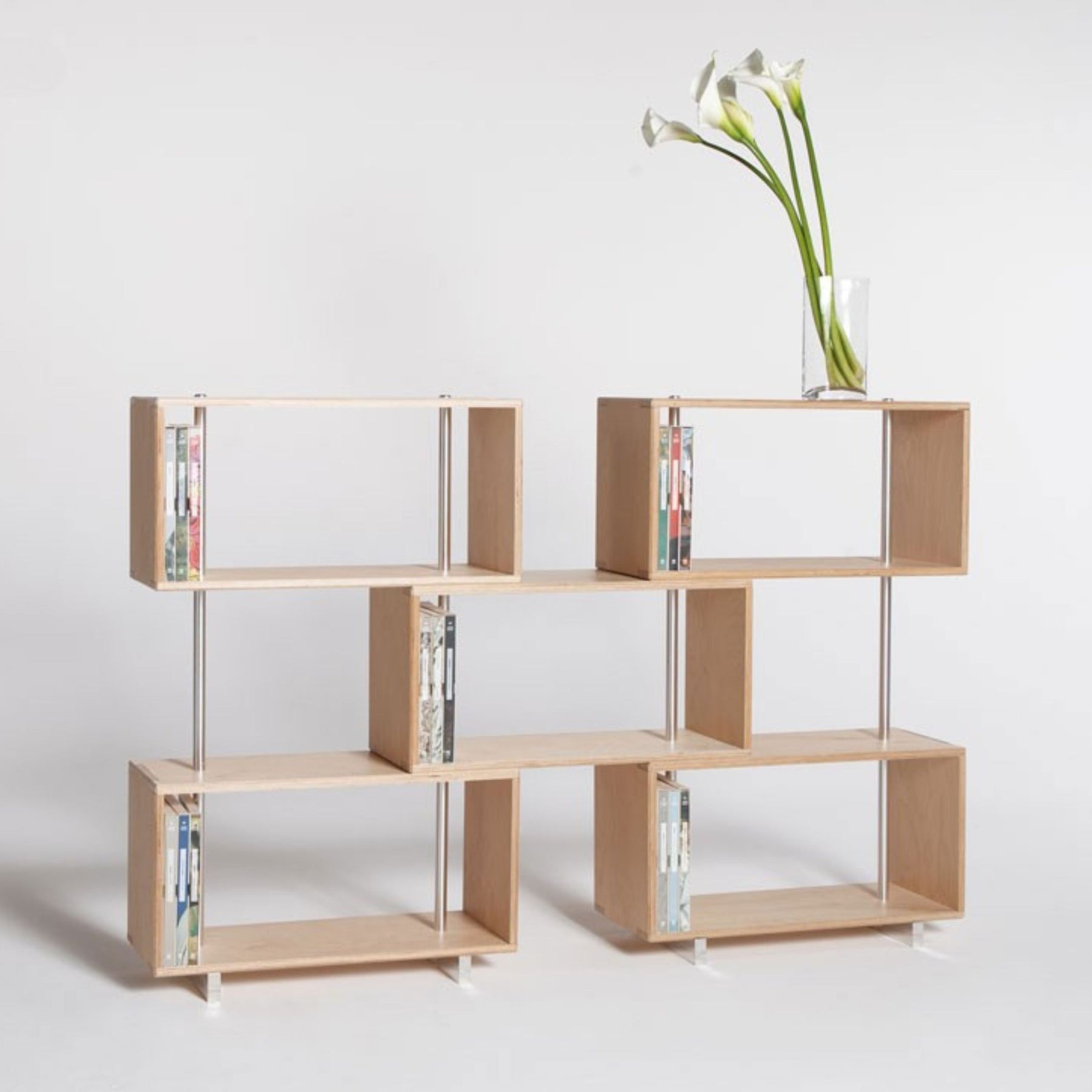 Continua is a modular furniture system that you can put together freely by following a few rules. The system consists of rectangular plywood modules and a vertical grid of aluminum rods. Continua was designed as a bookcase and can be used to organize, divide or even create a room within a room thanks to its numerous configurations. Its innovative shape can follow curved lines, making it particularly suitable for furnishing offices and stores as well as exhibition spaces that are frequently rearranged.