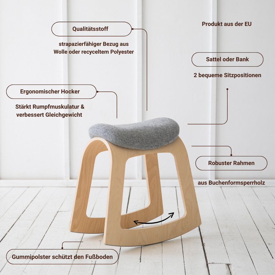 Muista is a healthy alternative to conventional desk chairs and you can decide for yourself how you want to sit. You change the sitting position by simply turning the chair. The two sitting positions differ from each other in that different muscle groups work when sitting: the saddle position allows you to rock forwards, while the bench position rocks sideways.