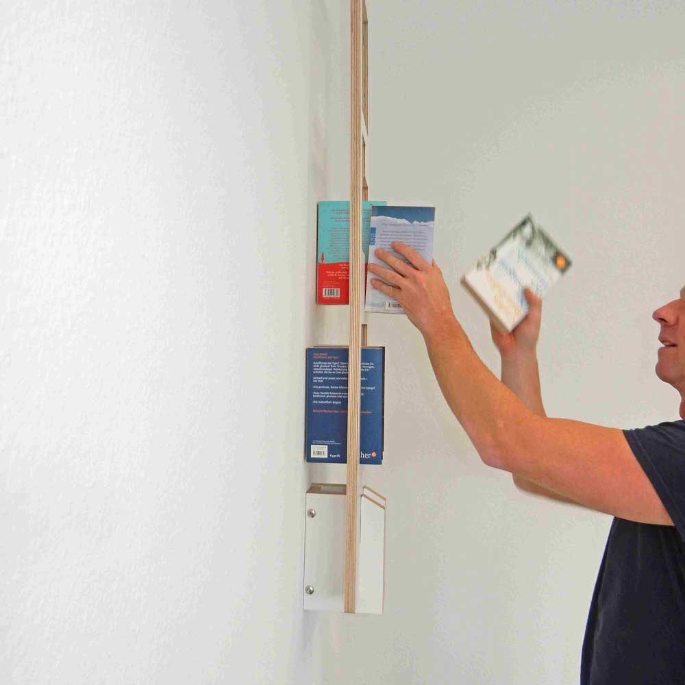 Mit dem Wandregal ‚Lesestoff‘ des Designers Ulf Seydell werden Bücher noch Schöner präsentiert. Das schmale Regal eignet sich perfekt für kleine Wandflächen oder zur Aufbewahrung der Bettlektüre im Schlafzimmer. Die Wandhalterung wird an die Wand gedübelt und das Brett nur eingesteckt, fertig ist die Wandskulptur.